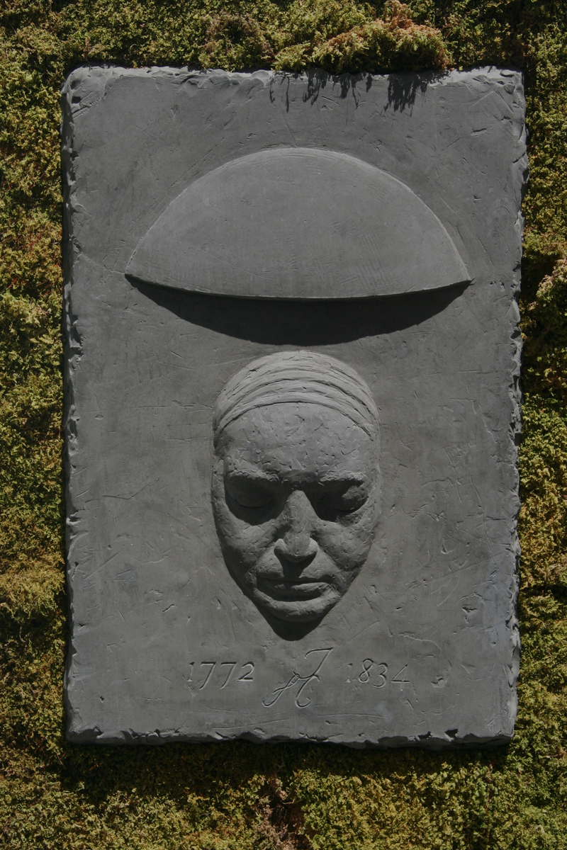 This portrait was commisioned as part of a temporary, collaborative installation at Dohm Alley, Princeton, NJ with the theme celebrating the English Romatic poets. Landscape architects, architects, and sculptors pooled their labor and passions to evoke the various themes and lives of the poets. I chose to sculpt William Taylor Coleridge. The portrait was done from a image of his death mask which is in Princeton's University's collection. The dome above his head nods to his poem Kubla Kahn and its pleasure dome. The color of the cement cast reaches back to the slate gravestones of England. The dates at the bottom of the relief are his birth and death. The ligature between those dates are of his initials in his cursive style.